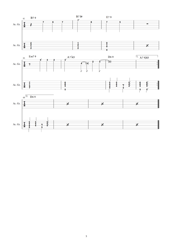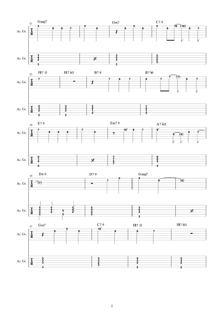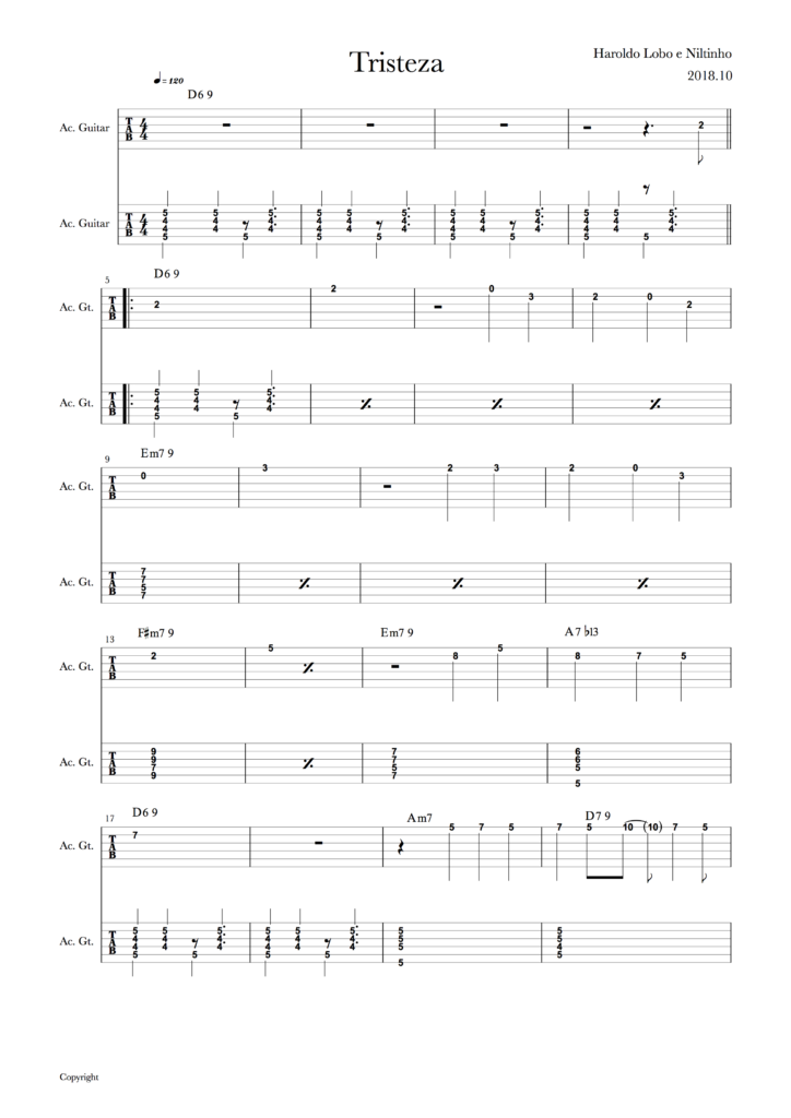 Tristeza Score (Bossa Nova) 投稿者 iida – 投稿日: 2018年10月5日2018年10月5日 ボサノバギタークラスの練習曲 「Tristeza」のタブ譜を紹介します。